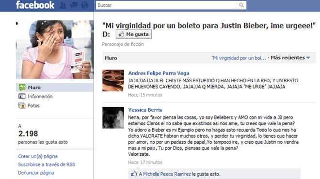 몬테레이에 산다는 이 소녀는 최근 페이스북에 페이지를 개설하고 자신의 순결을 살 사람을 구하고 있다. 소녀는 페이지에 ‘급급! 내 순결과 저스틴 비버 콘서트 티켓 교환함’이라는 제목을 달았다.