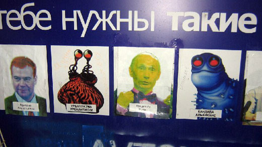“당신은 이 같은 동료가 필요합니까?”라는 문구가 적힌 이 광고판에는 임질과 캔디다, 유레아플라즈마 같은 성병을 옮기는 세균 그림 일부를 러시아 주요 관료의 얼굴로 바꿔놔, 이들을 존재를 부정하고 있다.