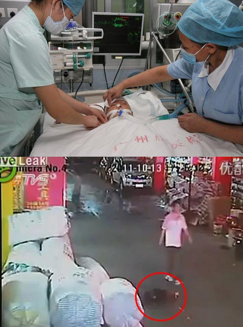 그러나 중상을 당한 아이를 지나가던 시민 17명이 그대로 방치했고, 심지어 뒤따르던 차량은 쓰러진 아기를 다시 치고 달아나 중국은 물론 전세계에 충격을 던졌다.