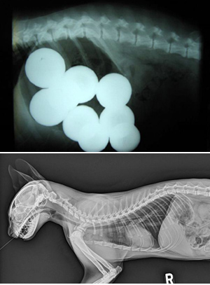 이중 눈길을 끈 사진은 기타줄을 그대로 삼킨 고양이. 이 고양이의 X-레이 사진을 보면 몸 전체에 기타줄이 펼쳐져 있다. 이밖에도 주인의 틀니를 삼킨 개, 접착제를 통째로 삼킨 개도 눈길을 끌었다.