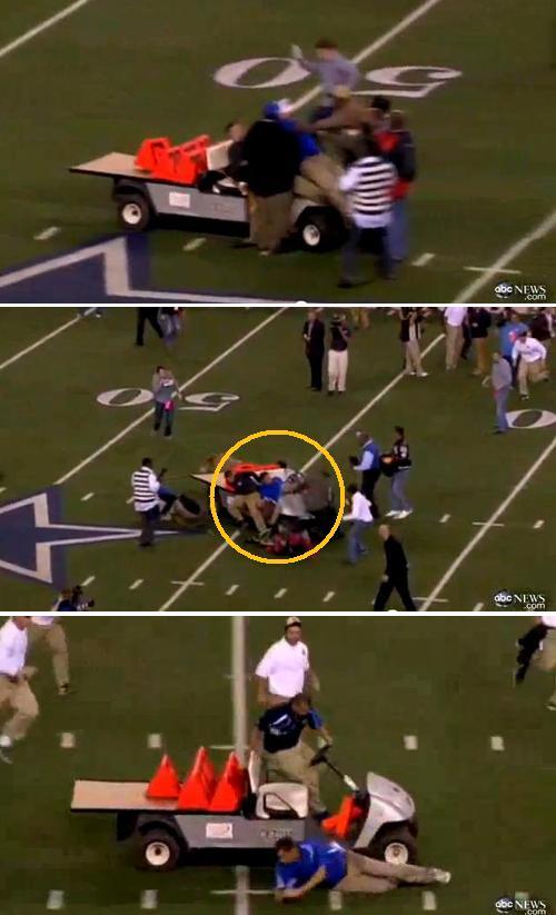 당시 상황을 중계하던 캐스터 크레이크 웨이는 “이제까지 경기장에서 본 가장 이상한 일”이라고 말했다. 카우보이 스타디움 대변인 브레트 다니엘스는 “현재 정확한 사고 원인을 조사중” 이라고 발표했다.