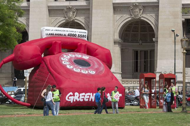 환경단체 그린피스가 29일(현지시각) 수도 부에노스 아이레스에 대형 전화기 모형을 설치하고 시위를 시작했다고 현지 언론이 보도했다.