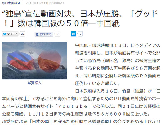중국 환구시보가 13일 일본 언론 보도를 인용해 “일본이 유튜브에 공개한 독도의 영유권을 주장한 홍보영상의 조회수가 56만 회를 넘어 ‘같은 시기 공개된 한국 측 홍보영상을 압도하고 있다’”고 보도했다.