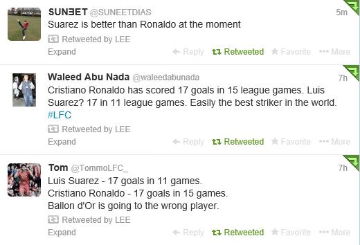 이런 두 선수의 비교에 대해서 일부 팬들은 ‘수아레스가 호날두보다 못하다고 할 근거가 없다’라고 주장하고 있고 또 다른 팬들은 ‘수아레스가 뛰어난 건 맞지만 아직 호날두에 비교하긴 이르다’라고 주장하고 있다. 특히, 수아레스의 경우 소속팀이 리그 경기에만 집중할 수 있기 때문에, 호날두에 비해서 리그에서 더욱 위력을 발휘할 수 있다는 점도 고려해야 한다.