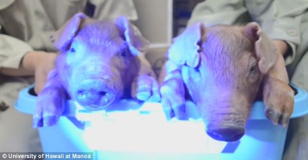해파리 유전자를 어미 돼지 배아에 주입해 만들어 낸 이 야광 돼지는 겉보기에는 평범해 보이지만 불을 끄면 초록색 야광빛을 띤다.