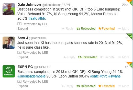 EPSN이 연말을 기념해 공식 SNS계정을 통해 보도한 각종 통계자료들에 의하면, 기성용은 2013년 모든 경기에서 91.2%의 패스성공률을 기록했다. 이는 토트넘의 미드필더 무사 뎀벨레의 90.5%보다 높은 기록으로 EPL 1위 기록이다. 유럽 5대 리그로 눈을 돌려도 기성용보다 높은 패스 성공률을 기록한 것은 나폴리의 발론 베라미(91.7%)뿐이다. 즉, 유럽 5대 리그의 모든 미드필더, 공격수를 통틀어 2위의 패스성공률을 기록했다는 것이다.