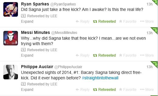 감정을 배제해야 하는 방송 해설가가 저렇게 말할 정도이니, 팬들의 반응이 더 과격한 것은 불 보듯 뻔한 일. 기사에는 옮기기 힘든 욕설을 하는 팬들부터 시작해서 “아니 이거 무슨 새해 기념 농담인가?”, “내가 아직 잠에서 덜 깬 건가, 이게 꿈인가 생시인가”, “카솔라와 아르테타를 두고 사냐가 프리킥을 찬다고? 벵거, 프리킥이 장난이야?”라고 성토하는 팬들까지 다양하다. “2014년, 의외의 장면 제 1호”라고 재치있게 표현한 팬도 있다.