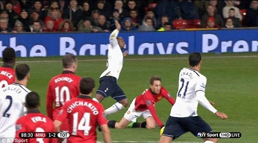 첫번째 사진=맨유 토트넘 전에서 다이빙을 시도하고 있는 야누자이(BT 스포츠 중계화면 캡처)