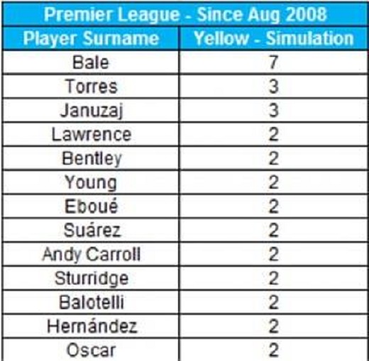 다이빙 동작으로 옐로우 카드를 2회 받은 선수들은 다수 있는데 이 중에는 팬들이 익히 아는 ‘다이버’들인 애슐리 영을 비롯, 리버풀의 루이스 수아레스, 첼시의 오스카 등이 집계됐다.