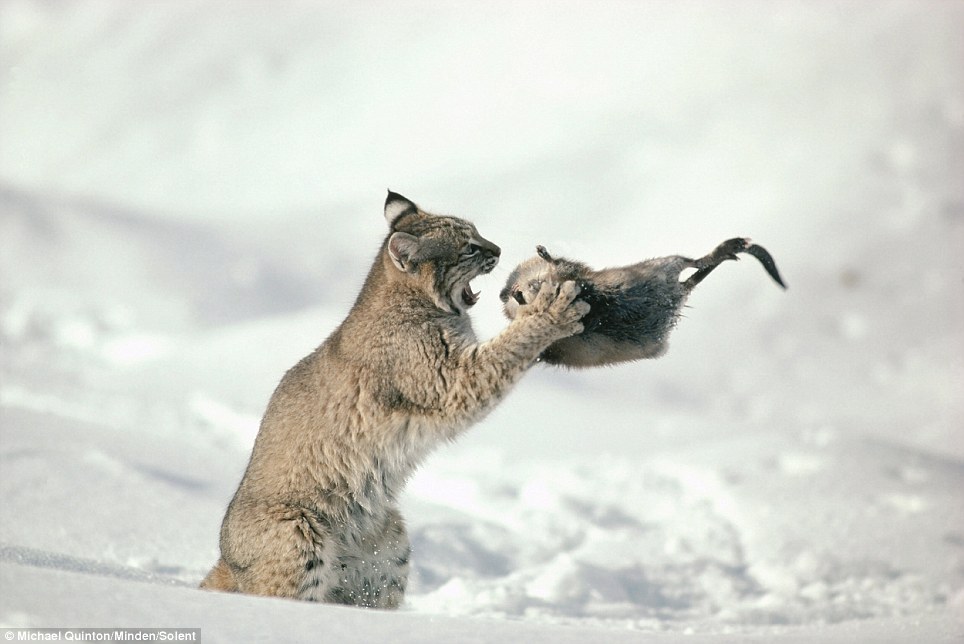 이 장면을 포착한 사진작가 마이클 퀸톤(60)은 “보브캣은 특유의 후각 능력으로 설원 속에서 먹잇감을 잘 찾아낸다” 면서 “사향쥐를 한번에 제압한 보브캣은 ‘저녁감’을 입에 물고 어디론가 사라졌다”고 밝혔다.