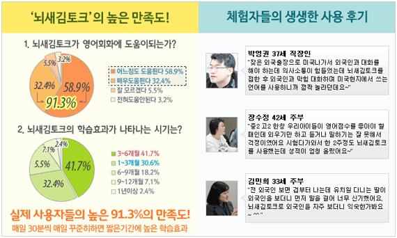 실제 사용자를 대상으로 실전 영어회화에 도움이 되고 있는지를 물은 결과 91.3%가 “그렇다”고 답했으며, 학습효과가 나타나는 시기로는 1~3개월이 30.6%로 2위, 3~6개월이 41.7%로 1위를 차지해 비교적 이른 기간 내에 효과가 나타나는 것으로 조사됐다. 또 매일 30분 정도의 짧은 학습 시간으로 2~3개월 만에 원어민 발음 습득과 외국인과의 의사소통을 가능하게 한 1:1 맞춤식 학습방식은 사용자들에게 높은 만족도를 보였다.