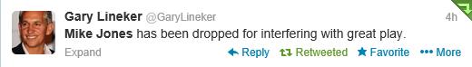 영국의 레전드 스트라이커이자, 현재는 해설가 및 칼럼니스트 등으로 활동하고 있는 게리 리네커는 본인의 트위터 계정을 통해 “위대한 플레이를 ‘방해한’ 이유로 마이크 존스 주심이 배정을 받지 못했다”며 오프사이드 규정을 빗대어 표현하기도 했다.
