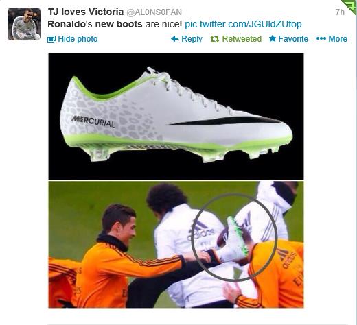 사진= 호날두의 새 축구화 디자인과, 훈련중 이를 착용하고 있는 호날두(트위터)