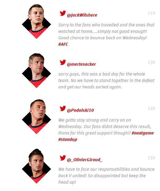 이날 선발로 출전해 풀타임을 뛴 미드필더 잭 윌셔, 수비수 메르테사커 등은 모두 ‘Sorry’(미안하다)로 시작하는 메시지를 팬들에게 전달했고, 공격수 지루와 포돌스키 역시 사과의 메시지를 전하며 맨유 전에 집중하겠다는 모습을 보였다.