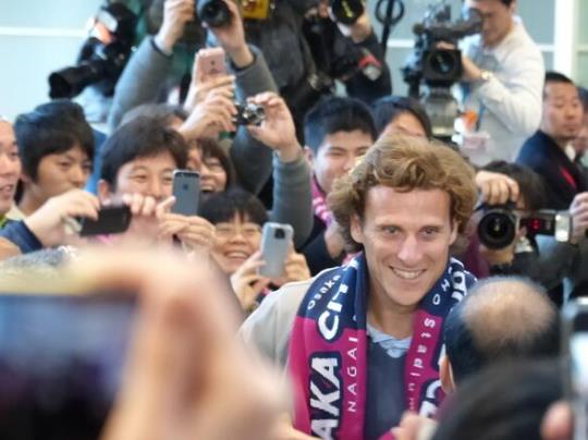 2010 남아프리카공화국 월드컵 최우수선수 디에고 포를란(우루과이)이 오사카 홈팬 300명이 공항까지 환영하러 나온 가운데 일본에 도착했다고 일본의 니칸스포츠가 12일 보도했다.