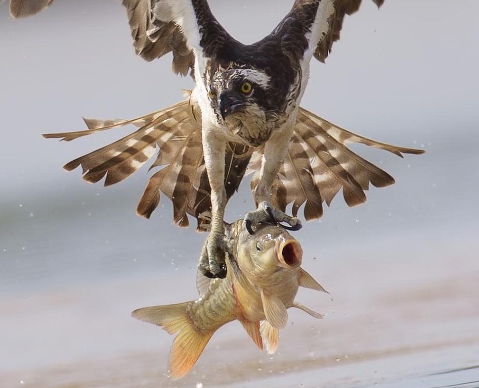하지만 타고난 사냥꾼인 물수리는 기회를 놓치지 않았다. 비교적 적당한 크기의 잉어가 눈에 들어오자 물수리는 천천히 수면위로 다가가기 시작했다. 잉어가 위협을 느낄 무렵, 물수리는 순간시속 128㎞의 스피드로 잉어를 낚아채는데 성공했다.