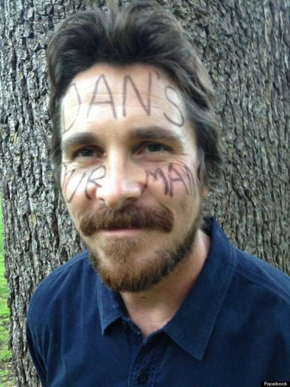 베일은 종이 대신 자신의 얼굴에 직접 “댄은 우리 가족이다”(Dan’s Our Man)라는 글자를 적은 뒤 인증샷으로 공개했다. 이어 “진짜 슈퍼히어로에게!”라는 메시지를 덧붙였다.