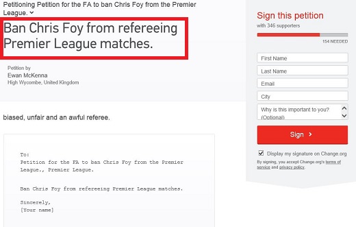 최근 맨유 미드필더 톰 클레버리에 대한 청원과, 러시아 동계올림픽에서 김연아에 대판 재판정을 촉구하는 청원 등이 진행됐던 온라인 청원 사이트 ‘Change.org’에 게재된 이번 청원은 “크리스 포이는 편향적이고 불공평하며 끔찍한 심판이다”는 메시지와 함께 시작되어 시작된지 몇시간 만에 350명이 참가한 상태다.
