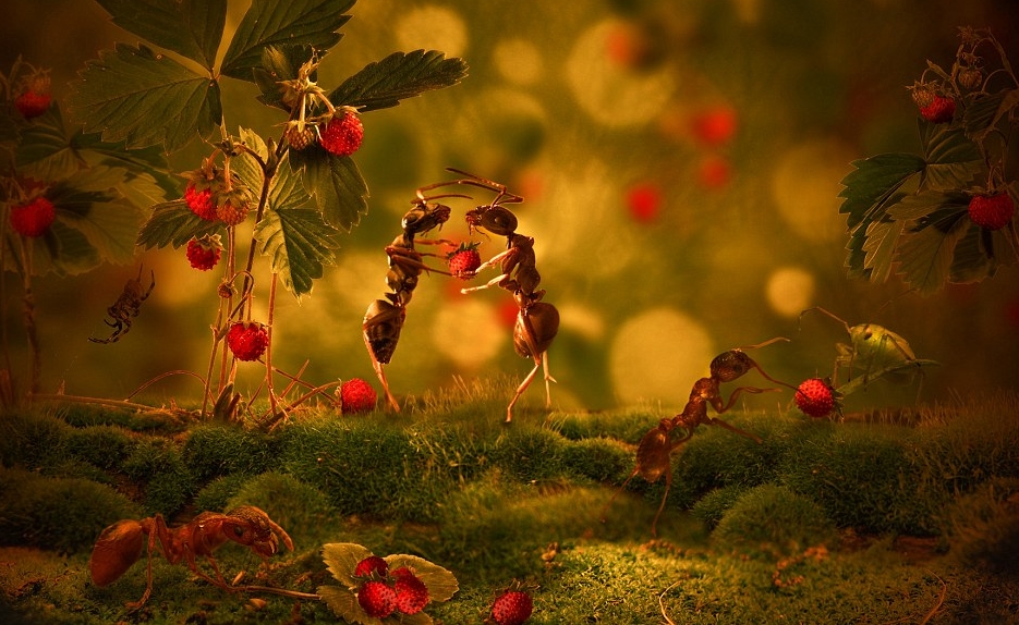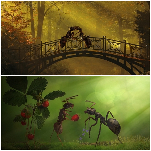 이외에도 고풍스러운 다리 위에서 키스를 나누는 개미 커플, 녹색 잎사귀 밑에서 사랑을 속삭이는 개미 커플 등 마치 판타지 영화 속에 나올법한 사진들을 보면 어떻게 이런 장면을 찍을 수 있었는지 궁금증이 더해진다.