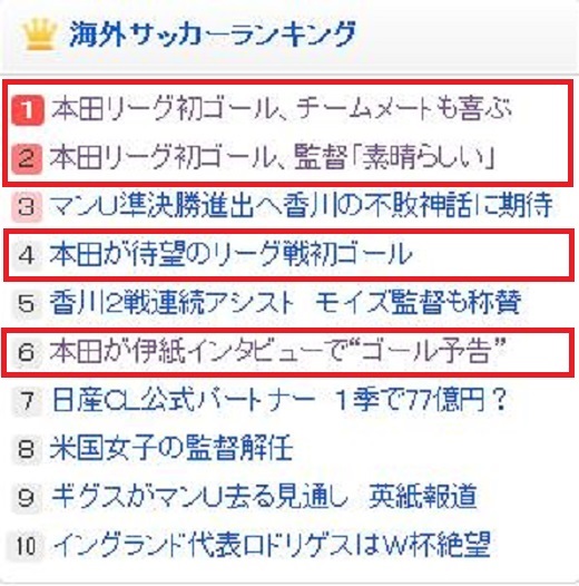 한편 일본의 축구 팬들은 축구 커뮤니티나 SNS 채널을 통해 최근 경기에서 어시스트를 기록하는 등 점점 나아진 모습을 보이고 있는 맨체스터 유나이티드의 카가와 신지와 함께 혼다가 드디어 리그 첫 골을 기록하자 해당 뉴스 및 동영상을 서로 공유하며 기뻐하고 있다.