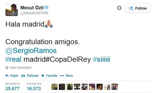 그런 외질이 자신의 친정팀 레알 마드리드가 FC 바르셀로나를 2-1로 꺾고 코파델레이 우승을 차지한 직후 이를 축하하는 메시지를 자신의 SNS에 남겨 축구팬들 사이에서 화제가 되고 있다. 외질은 자신의 SNS에 “알라 마드리드(레알 마드리드의 응원구호), 축하해 친구들”이라는 메시지를 남겼다.