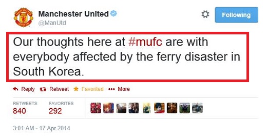 세월호 침몰 사고의 실종자 수색작업이 난항을 겪으며 국민들의 마음을 아프게 하고 있는 가운데, 박지성의 오랜 소속팀으로 한국 축구팬들에게도 익숙한 영국 프리미어리그 ‘맨체스터 유나이티드’ 구단이 공식 트위터 계정을 통해 “우리의 생각은 한국의 세월호 사고와 관련된 모두와 함께 있다”는 메시지를 남겼다.