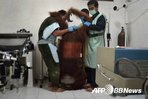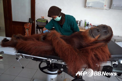 공개된 사진 속 오랑우탄은 옆에서 수술 중인 여성 수의사가 조그맣게 보일 정도로 커다랗다. 안정제 때문인지 표정은 나른하고 측은해 보인다.