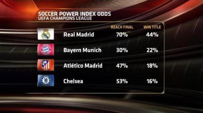 다음으로, 최종 우승 팀에 대해 ESPN은 레알 마드리드가 우승할 확률을 44%로 평가하며 나머지 3팀에 비해 월등히 높게 내다봤다. 2위는 바이에른 뮌헨(22%), 그 뒤를 아틀레티코 마드리드(18%), 첼시(16%)가 차지했다.