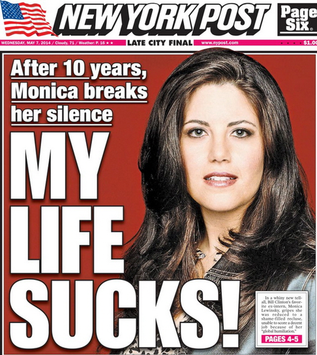 모니카 르윈스키는 6일(현지시각) 미국 연예 전문 잡지인 “베니티 페어(Vanity Fair)’에 기고 형태의 인터뷰를 통해 당시 빌 클린턴 전 대통령과의 부적절한 관계에 대해 “깊이 후회한다”는 심정을 밝혔다.