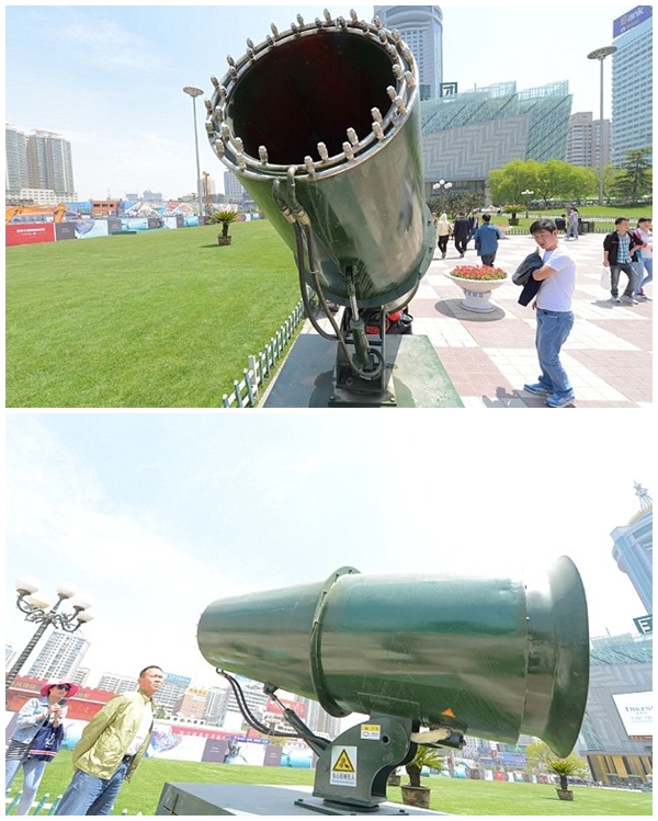 란저우 시내 지하철 1호선이 지나는 동방홍 광장에 설치된 이 ‘초대형 분무기’는 수돗물을 끌어들여 분사하는 원리로 운영되며 최대 600미터 반경 내의 먼지를 씻겨내는 효과를 발휘하는 것으로 알려져 있다.