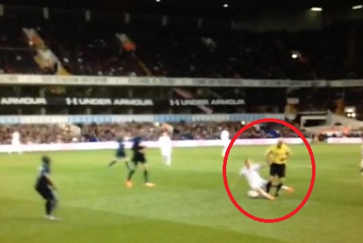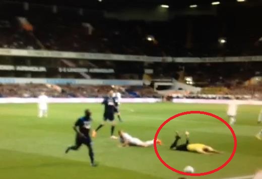 사진설명 1=하워드 웹에게 백태클을 시도하고 있는 토트넘의 홀트비(Vine 동영상 캡쳐)