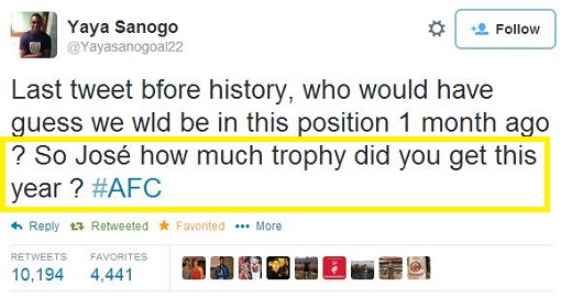 야야 사노고는 “역사를 만들기 전의 마지막 트윗, 한 달 전에 누가 우리가 이 자리에 있을 것이라고 생각했겠는가”라고 운을 뗀 후 “그래서 무리뉴, 올해 트로피 몇 개 들었나?”라는 메시지를 남겼다. 이번 시즌, 벵거 감독을 ‘실패전문가’라고 불렀던 무리뉴 감독이 ‘무관’에 그친 반면, 아스널은 FA컵 우승을 차지했다는 뜻의 메시지였다.