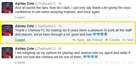 애슐리 콜은 20일 본인의 공식 트위터 계정을 통해서 “현재 다음 시즌에 내가 가진 옵션에 대해 에이전트와 논의 중”이라며 “슬프게도, 첼시는 그 옵션 중에 포함되어 있지 않다”고 말했다.