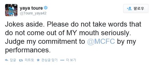 야야 투레는 20일 본인의 공식 트위터 계정을 통해 “내 입에서 직접 나오는 말이 아니면 심각하게 받아들이지 말라”며 “맨시티에 대한 내 마음을 내 경기력을 통해서 판단해달라”는 메시지를 남겼다. 또 “방금 맨시티에게 생일 축하 편지를 받았다”며 “우체국에서 잘못 배송한 모양”이라는 농담도 던졌다.