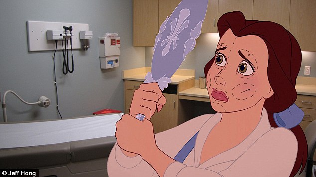 무릎을 탁 치게 만드는 명장면의 주인공은 바로 ‘미녀와 야수’ 속 주인공 벨이다. 그녀는 더욱 아름다운 외모를 위해 성형외과를 찾아 수술 받을 부위를 미리 펜으로 그린 뒤 거울을 바라보고 있다. 그녀 뒤에는 병원의 하얀 수술대와 각종 도구들이 즐비해 있다.