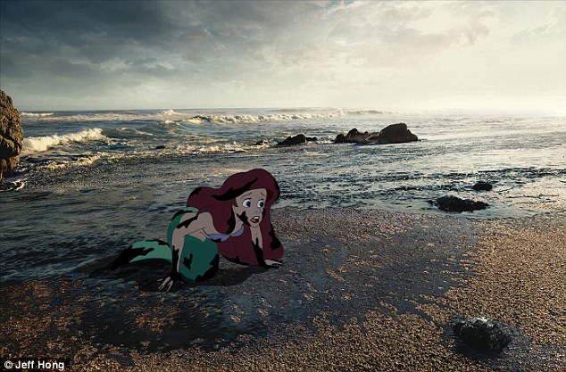 예컨대 디즈니의 대표작 ‘인어공주’ 속 주인공인 에리얼은 맑고 푸른 바닷속, 푸른 하늘 아래 파도가 넘실거리는 모래사장이 아니라 기름이 잔뜩 유출된 거무튀튀한 바다에 엎드려 당황한 표정을 짓고 있다.