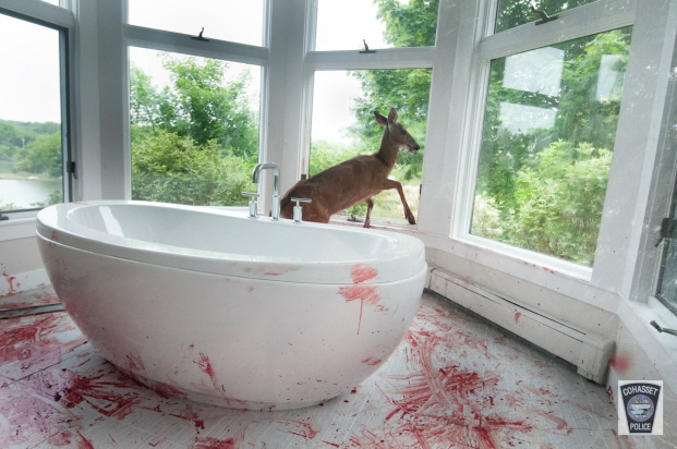 길 잃은 암사슴 한 마리가 욕실을 둘러싸고 있는 투명한 유리창문을 박살 내면서 안으로 들어왔던 것. 혼자 있던 여주인은 너무 놀란 나머지 골프채를 들고 자신을 방어함과 동시에 경찰에 구조를 요청했다.