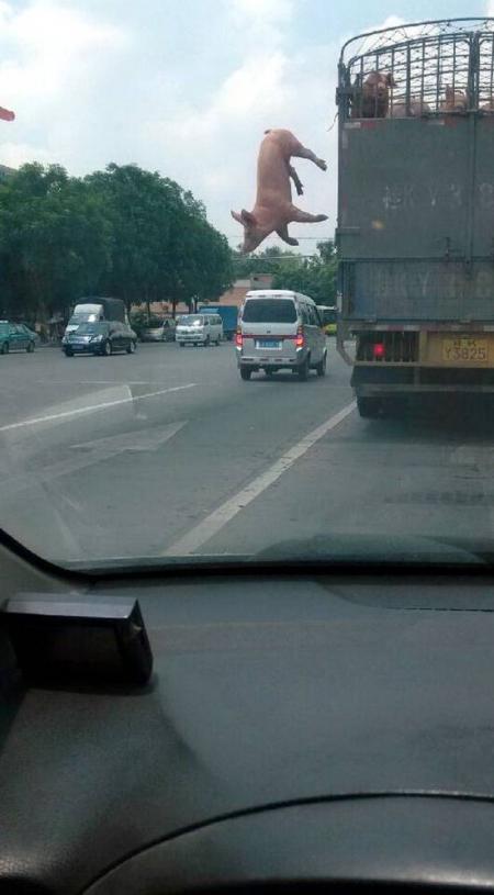 최근 중국 광시성의 한 도로에서 트럭에 실려 도살장으로 향하던 돼지 한마리가 뛰어내려 도망치는 웃지못할 일이 벌어졌다.
