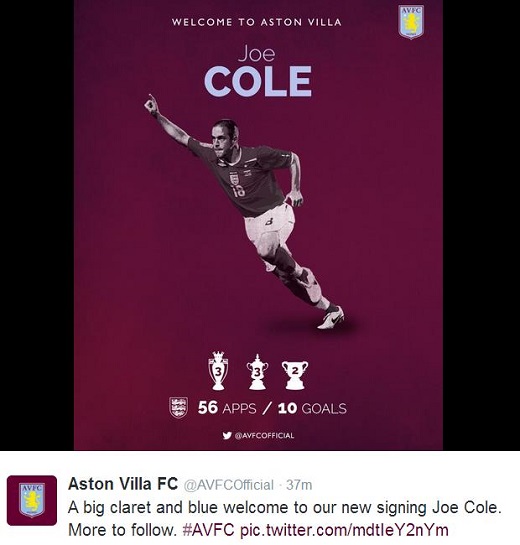 아스톤 빌라는 10일 공식 SNS 계정을 통해 조 콜이 아스톤 빌라에 입단했다는 속보를 전파하며 그의 잉글랜드 국가대표팀 시절에 대한 자료를 배포하고 나섰다. 조 콜 역시 팀과 처음 가진 인터뷰에서 아스톤 빌라 셔츠를 들고 “아스톤 빌라에 입단하게 돼 기쁘다”는 짧고 굵은 인사말을 남겼다.