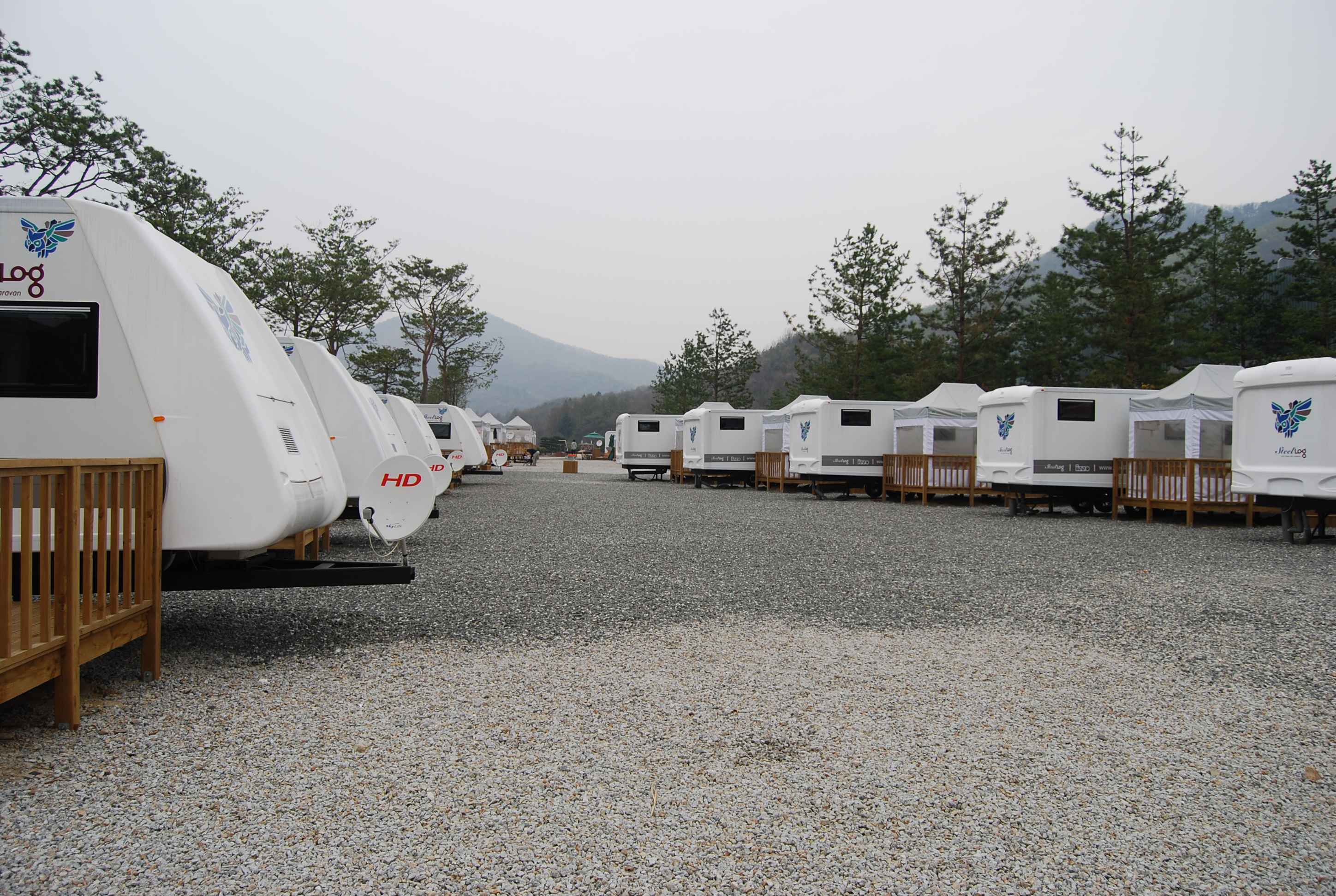스테이는 오크힐스 골프장 앞의 캠핑존. 20개 동의 트레일러형 캠핑카가 놓여 있다. 세계 10대 디자인 회사 이노디자인에서 설계한 스틸로그사의 캐러밴(견인형 캠핑카)이다. 대당 가격만 6000만원을 호가하는 명품. 침실, 화장실, 거실에 LCD TV까지 없는 게 없다. 4인승과 6인승으로 나뉘니 가족 사이즈별로 골라 잡으시라.