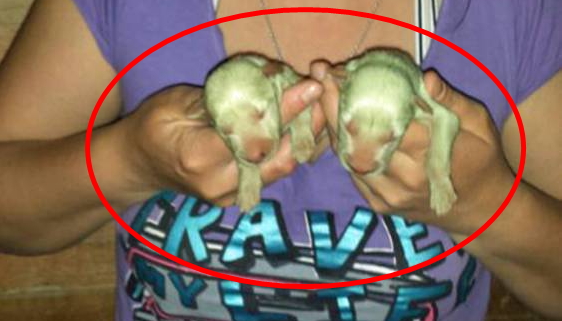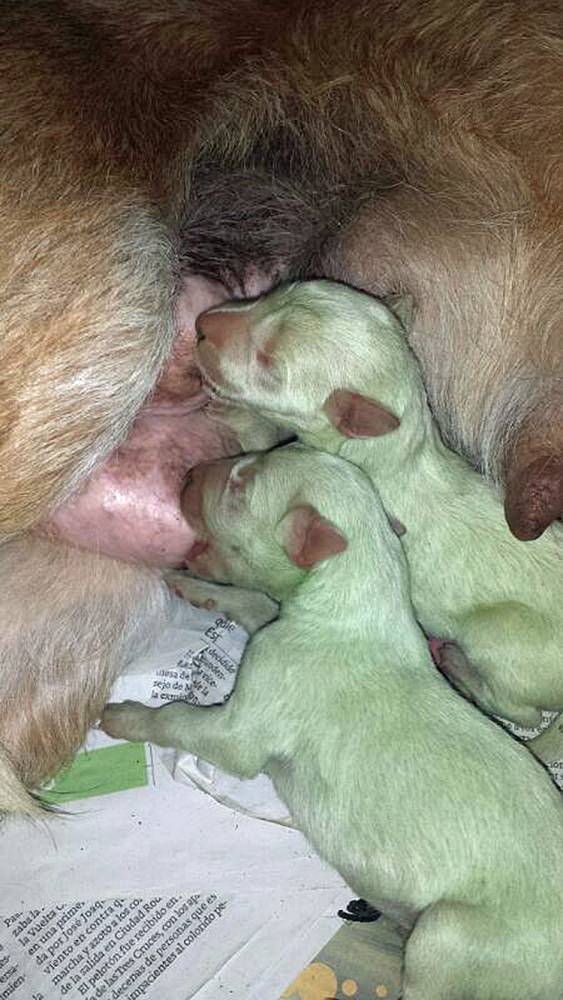 주인인 아이다 몰리나에 따르면 집에서 기르던 사냥개 혈통의 개가 최근 새끼를 낳았는데, 두 마리 모두 몸이 초록색이었다. 그녀는 이 강아지들이 애초에 초록색으로 태어났다는 생각을 하지 못하고 이를 닦아내려 했지만 소용없었다.