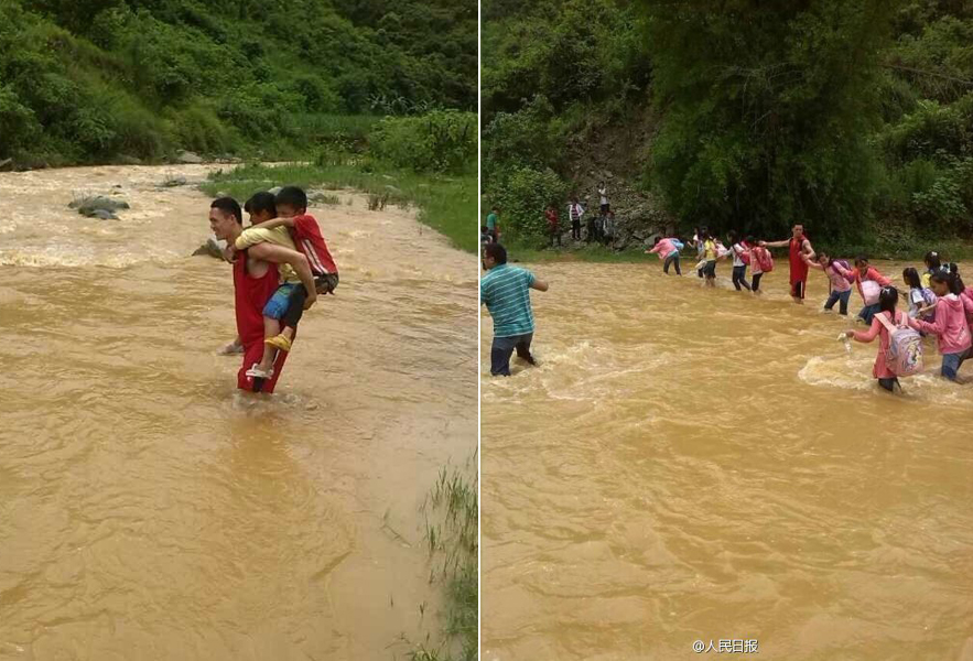 남부 윈난성 푸닝현은 여전히 홍수의 영향으로 뿌연 흙탕물이 소용돌이 치고 있다. 이에 인근 초등학교 교사들이 직접 나서 어린 학생들의 등교를 돕기 시작했다.