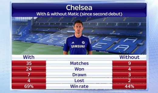 '69%(마티치가 출전한 경기에서의 첼시 승률) VS 44%(마티치가 출전하지 않은 경기에서의 첼시 승률)'