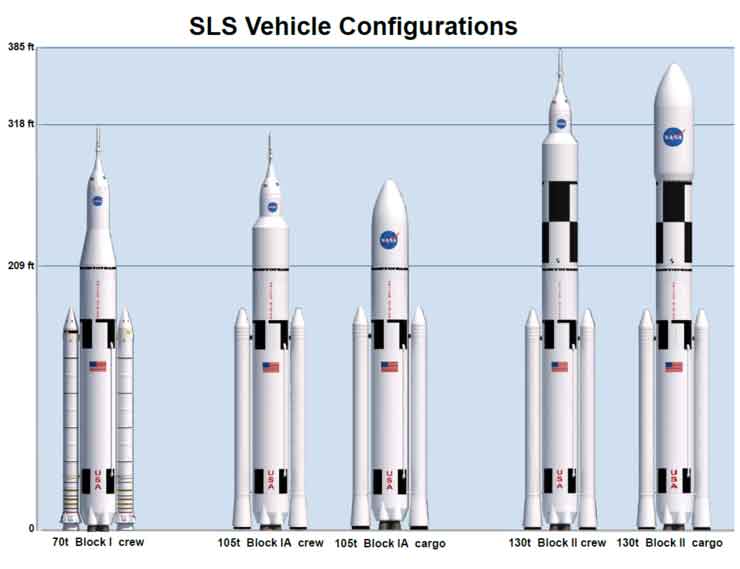 본래 우주 공간에 화물(인간을 달 너머로 보내기 위한 우주선과 착륙선을 포함)을 수송할 대형 로켓과 오리온 우주선을 발사할 중형 로켓 두 가지를 개발하는 계획은 수정되어 코어 스테이지라고 명명된 1단 로켓과 고체 로켓 부스터는 공유하고 2단 로켓 이상 부위를 달리하는 방식이 사용된다. 비효율적이긴 하지만 두 개의 로켓을 개발할 예산이 없는 상태에서는 고육지책이라고 할 수 있다. 대신 SLS는 화물과 오리온 우주선을 발사하는 페이로드 70t급, 105t급, 130t급 등 여러 버전이 있다.