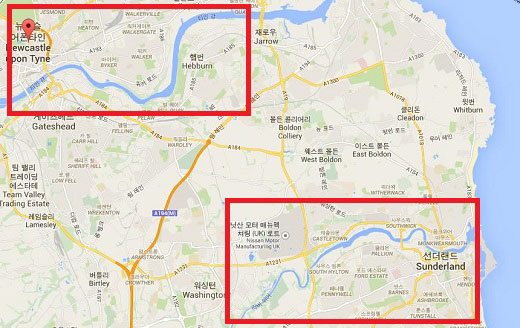 '타인위어더비'의 명칭은 뉴캐슬 지역을 흐르는 '타인강'과 선더랜드 지역을 흐르는 '위어강'에서 유래했습니다. 첨부 사진 속 빨간 네모 안에 흐르는 두 강이 각각 타인강과 위어강입니다.