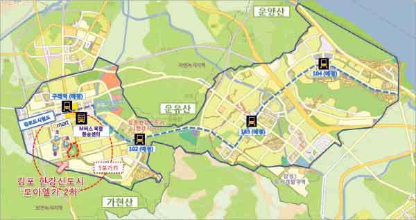 주변 입지로는 국내 3번째 규모의 이마트가 직선거리 600m내에 위치해 있으며, 중심상업지구도 도보로 이동이 가능하여 주거 편의성이 최적화된 지역에 위치하고 있다. 또한 김포도시철도 구래역(가칭)과 M버스 복합환승센터가 5분 정도 거리에 위치하고 있어 서울로의 진출입이 수월할 전망이다.
