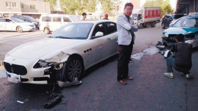 지난 9일 오후 중국 랴오닝성 선양시 톄시에서 좀처럼 보기힘든 승용차의 교통사고가 발생해 시민들의 눈길을 사로잡았다. 이날 사고 차량은 이탈리아의 고급명차 마세라티와 시내 택시.