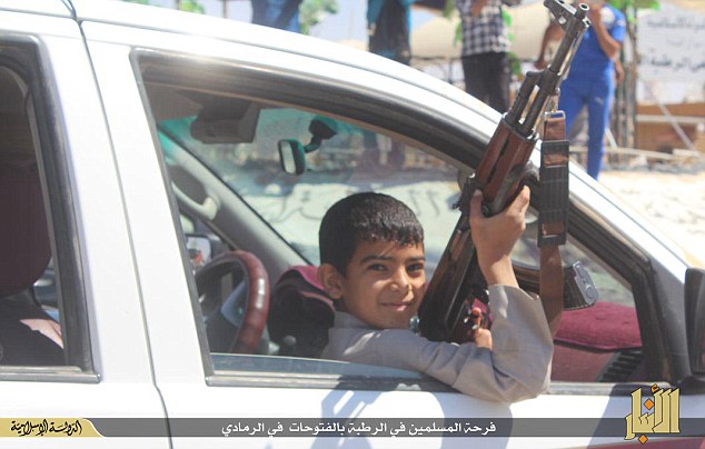 영국 데일리메일등 서구언론은 지난 18일부터 IS관련 SNS 계정을 통해 확산되고 있는 사진들을 공개했다. 라마디 함락을 자축하며 올린 이 게시물 중에서 유독 눈길을 끄는 것은 역시 아이들을 '홍보물'로 사용한 사진들이다. 이중 한 사진은 채 5살도 되지 않은 어린 소년이 박격포 혹은 바주카포를 들고있는 모습을 담고있다.
