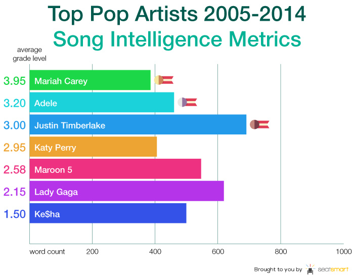 장르별로 보면, 팝 아티스트 중 독해 수준이 가장 높았던 노래는 미국 가수 머라이어 캐리의 곡이며 힙합 차트에서는 에미넴의 곡이었다.