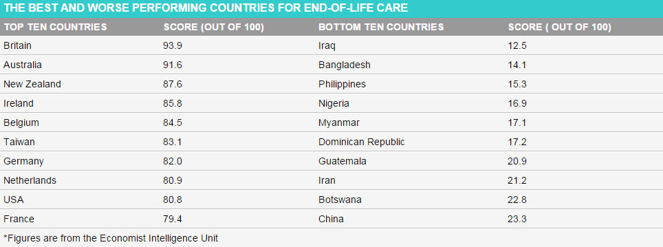 영국 경제전문지인 이코노미스트가 주관하는 ‘2015 죽음의 질 지수’ 통계에서는 영국이 100점 만점에 93.9점을 받아 1위를 거머쥐었다. 호주(91.6점), 뉴질랜드(87.6점), 아일랜드(85.8점), 벨기에(84.5점) 등지의 국가가 상위권에 랭크됐다.